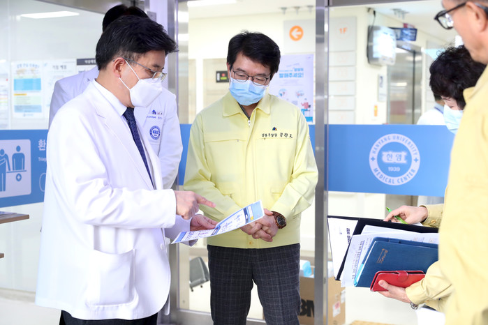 서울 성동구는 28일 우한폐렴 유입 차단 및 확산 방지를 위해 재난안전대책본부를 구성, 긴급 대책회의를 열고 보건소 및 한양대병원을 방문해 비상방역체계를 점검했다. 사진은 한양대병원에 방문한 정원오 구청장이 관계자의 설명을 듣는 모습. (사진제공=성동구청)