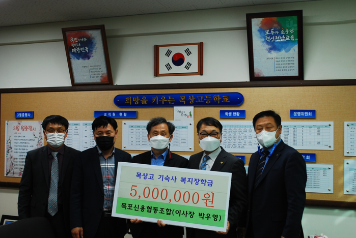 목포신협(이사장 박우영)은 목상고등학교에 “미래의 주역인 청소년들이 자신의 꿈을 이루기 위해 열심히 공부하고 지역사회 경제에 이바지 했으면 한다.”는 말을 전하며 기숙사 복지장학금을 전달했다.
