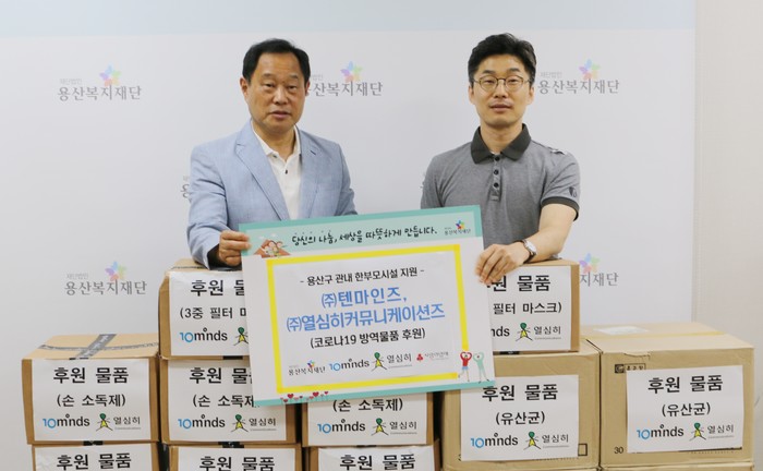 헬스케어 전문기업 (주)텐마인즈, 온라인광고대행사 (주)열심히커뮤니케이션즈가 지역내 미혼모를 비롯 보호가 필요한 자녀들의 코로나19 예방을 위해 1일 서울 용산복지재단에 마스크, 손 소독제 등의 코로나19 방역물품을 기부했다. 사진은 관계자들이 기념촬영을 하는 모습. (사진제공=용산구청)