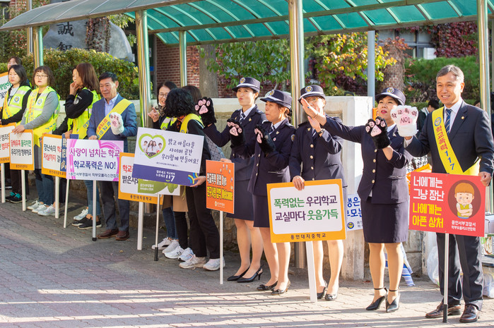 이날 이 의장과 황 위원장은 용인서부경찰서 여성청소년과의 주최로 열린 캠페인에서 박온서 대지중학교장 및 학교 관계자, 학생들, 김지수 학부모 폴리스 연합회장 및 연합단, 학부모, 경찰 관계자 등 50여 명과 함께 등교하는 학생들에게 학교 폭력의 중요성을 강조했다.