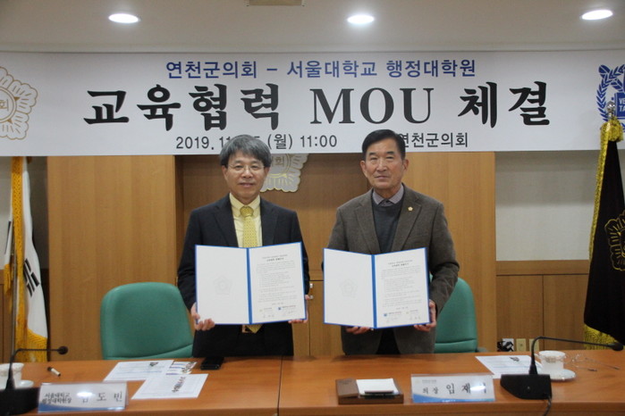 이번 협약은 지방자치와 분권 등의 급변하는 행정환경 속에서 서울대학교 행정대학원의 연구 노하우를 의정활동에 접목시켜 상호 협력관계 유지와 상생 발전을 도모하기 위해 마련됐다.