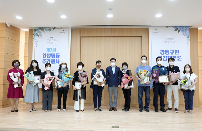 서울 강동구는 최근 ‘강동구민 공감대토론회’를 개최했다. 토론회는 100여명의 주민이 온라인에서 만나 비대면 화상회의로 진행됐고, 결정된 의제는 민·관 협력 숙의과정을 거쳐 오는 2022년 여성친화도시 조성을 위한 정책에 적극 반영할 계획이다. 사진은 토론회에서 이정훈 구청장(가운데)이 참여자들과 기념촬영을 하는 모습. (사진제공=강동구청)