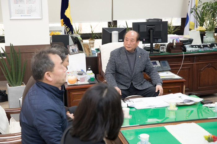 | ▲ 윤준용 의장(오른쪽)이 한국중소상인자영업자총연합회 회장단의 의견을 듣고 있다. (사진제공=영등포구의회) |