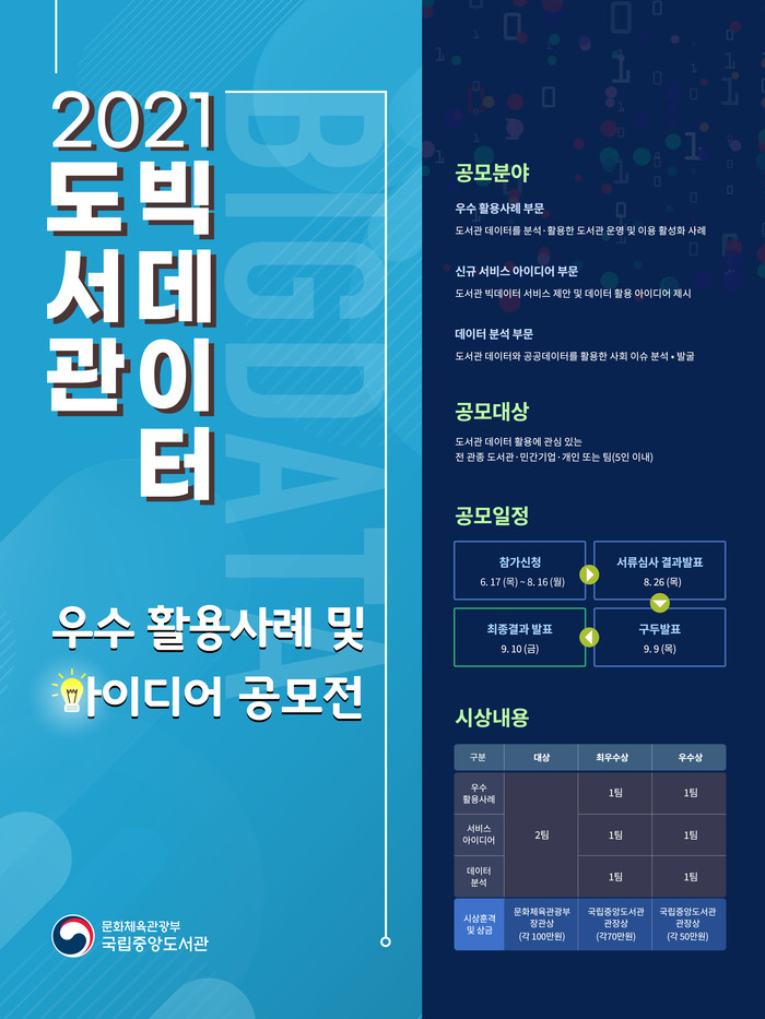 [시민일보 = 이대우 기자] 국립중앙도서관은 공공도서관을 포함한 전 관종 도서관, 민간기업, 개인(또는 팀)을 대상으로 ‘도서관 빅데이터 우수 활용사례 및 아이디어 공모’를 17일부터 오는 8월16일까지 실시한다.