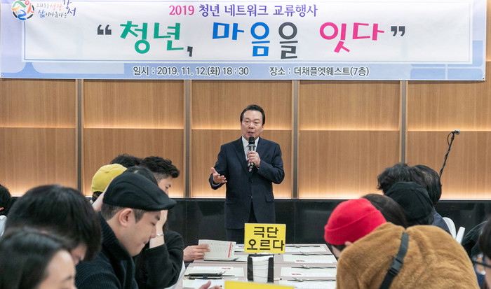 노현송 서울 강서구청장은 12일 더채플엣웨스트(양천로 476)에서 열린 ‘청년 네트워크 교류행사’에 참석해 청년들을 격려했다. 이날 행사는 청년 공동체 20개팀의 활동성과를 공유하기 위해 열렸다. 사진은 노 구청장이 인사말을 하는 모습. (사진제공=강서구청)