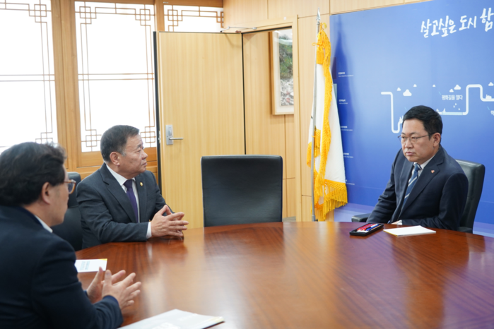 | ▲ 신득상 강화군의장(왼쪽)이 박남춘 인천시장을 만나 강화지역 현안사항을 설명하고 있다. (사진제공=강화군의회) |