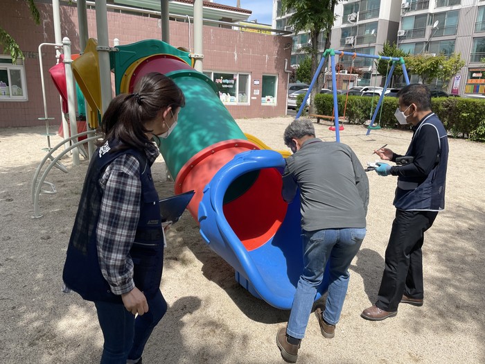 경기 이천시는 안전한 어린이 놀이환경 조성을 위해 최근 2021년 어린이놀이시설 안전점검을 2단계에 걸쳐 실시했다. 현장에서 발견된 사소한 결함은 즉시 보수를 요청하고, 수리·교체가 필요한 사항은 기한내 개선하도록 했다. 사진은 시 관계자들이 지역내 어린이 놀이시설을 점검하고 있는 모습. (사진제공=이천시청)