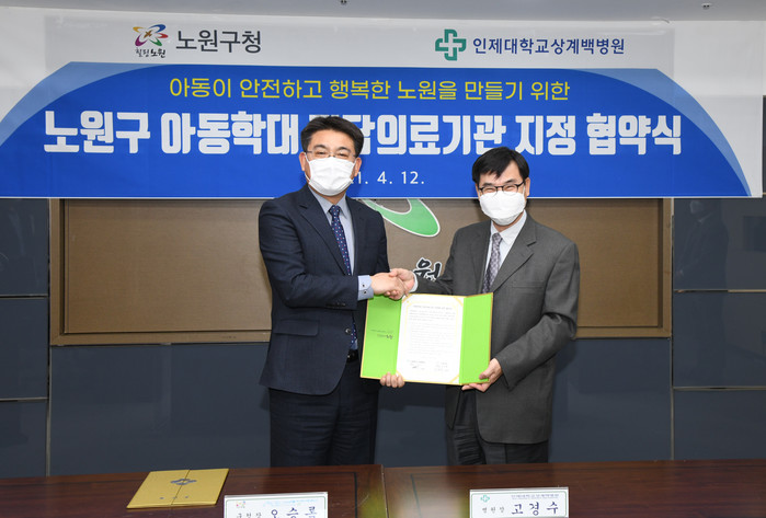 서울 노원구는 지난 12일 인제대학교상계백병원과 노원구 아동학대 전담의료기관 지정 협약식을 진행했다. 협약의 주요 내용은 아동학대 예방 협력, 아동학대 범죄 신고 아동 우선 진료 및 진단 등이다. 사진은 협약식에서 오승록 구청장(왼쪽)이 기념촬영을 하고 있는 모습. (사진제공=노원구청)