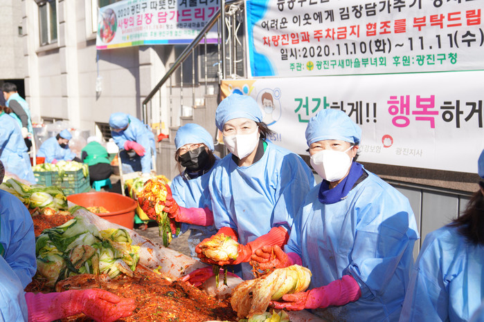 [시민일보 = 여영준 기자] 서울 광진구의회(의장 박삼례) 의원들이 최근 광진구 새마을회관과 능동 정자마당에서 열린 ‘2020 광진구 새마을부녀회 사랑의 김장 담가드리기 행사’에 동참했다.