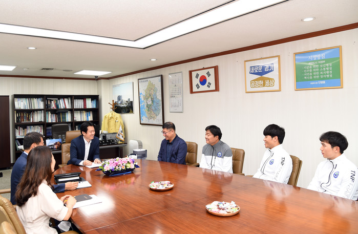 황범순 경기 의정부시 부시장이 최근 '2020 KBS 양양 전국사이클대회'에서 우수한 성적을 거두고 돌아온 의정부시청 사이클팀의 박상훈, 차동헌 선수를 격려했다. 사진은 황 부시장이 사이클 선수단과 이야기하는 모습. (사진제공=의정부시청)