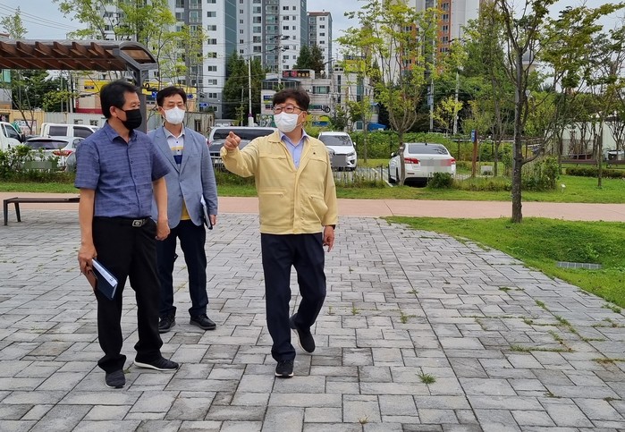 경기 수원시 영통구는 지난 27일 안전하고 쾌적한 지역내 환경조성을 위해 이의동 1373-7번지 일원, 망포동 755번지 지성공원 일원 등 도로 및 공원 현장 확인을 통해 문제점을 파악하고 주민불편 해소방안을 모색했다. 사진은 김용덕 구청장(오른쪽)과 관계자들이 현장 점검을 하고 있는 모습. (사진제공=영통구청)