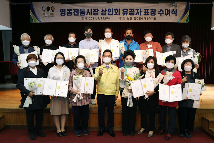 정순균 서울 강남구청장은 25일 코로나19 장기화로 침체된 전통시장 상권을 되살리고 소상공인 지원에 힘쓴 영동전통시장 상인회 임원 등 15명에게 표창과 감사장을 수여했다. 사진은 수여식에서 정 구청장(앞줄 가운데)과 수상자들이 기념촬영을 하는 모습.(사진제공=강남구청)