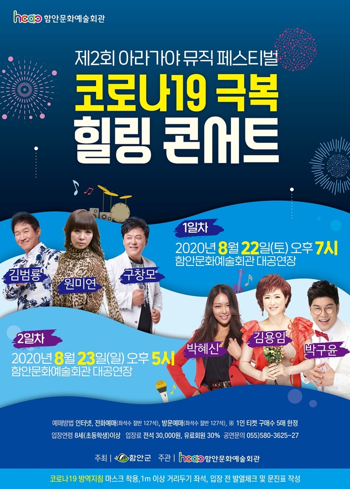 이번 ‘코로나19 극복 힐링 콘서트’는 작년 성황리 펼쳐졌던 제1회 아라가야 뮤직페스티벌 공연을 대공연장 무대로 옮겨, 코로나19로 힘든 시간을 보내는 군민들에게 활력을 주고 웃음과 즐거움을 선사한다.
