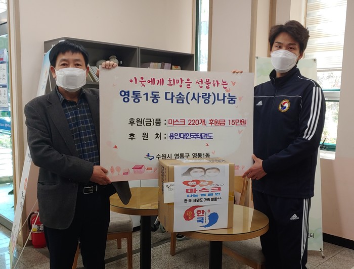 경기 수원시 영통구 영통1동 소재 용인대 한국태권도는 지난 13일 원생들과 함께 모은 코로나19 예방 마스크 220여개와 후원금 15만원을 영통1동 행정복지센터에 전달했다. 사진은 관계자들이 기념촬영을 하는 모습. (사진제공=영통구청)