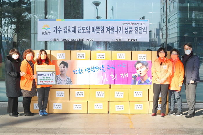 서울 금천구는 지난 18일 트로트 가수 김희재씨 팬들로부터 따뜻한 겨울나기 성품으로 라면 100상자(200만원 상당)를 전달받았다. 구는 후원품을 독산2동 주민센터를 통해 취약계층에 전달할 예정이다. 사진은 전달식에서 관계자들이 기념촬영을 하고 있는 모습. (사진제공=금천구청)