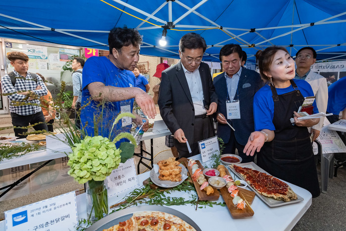 최근 서울 광진구가 침체된 지역 상권에 활력을 불어넣기 위해 구의역 일대 미가로 맛의 거리에서 ‘미가로 블록파티’를 개최했다. 사진은 파티에 참석한 김선갑 구청장이 요리경연대회 시식을 하고 있는 모습. (사진제공=광진구청)
