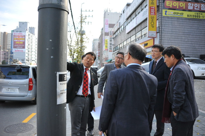 | ▲ '불법광고물 부착방지사업 현장'을 방문한 복지건설위원들이 관계자들과 사업 실효성에 대해 이야기를 나누고 있다. (사진제공=양천구의회) |