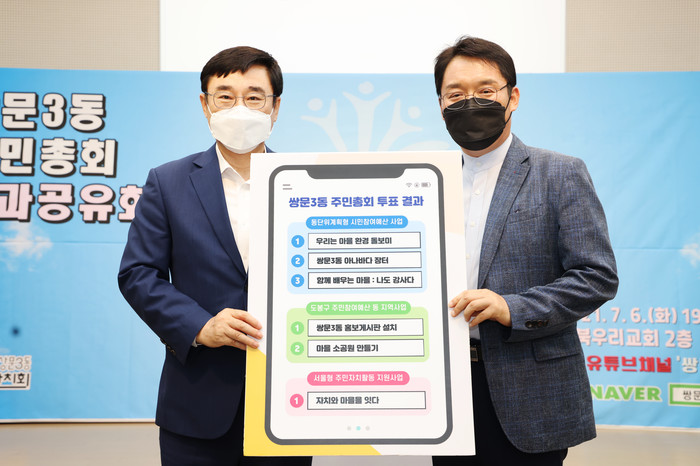 서울 도봉구 쌍문3동 주민자치회는 지난 5~6일 ‘쌍문3동 주민총회’를 개최했다. 총회는 쌍문3동에 거주하거나 직장·단체에 소속된 주민이면 누구나 참여해 투표할 수 있고, 투표는 온·오프라인으로 진행됐다. 사진은 이동진 구청장(왼쪽)이 6일 도봉구쌍문3동 주민총회 결과공유회에서 투표 결과 팻말을 들고 기념촬영을 하는 모습. (사진제공=도봉구청)