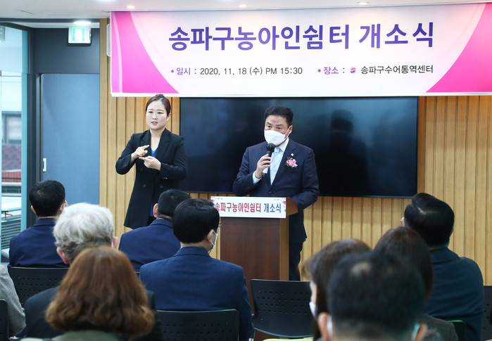[시민일보 = 이대우 기자] 이황수 서울 송파구의회 의장이 최근 신축된 송파구수어통역센터(문정로 13) 내에 조성된 농아인쉼터 개소식에 참석, 시설물을 관람하고 관계자들을 격려했다.