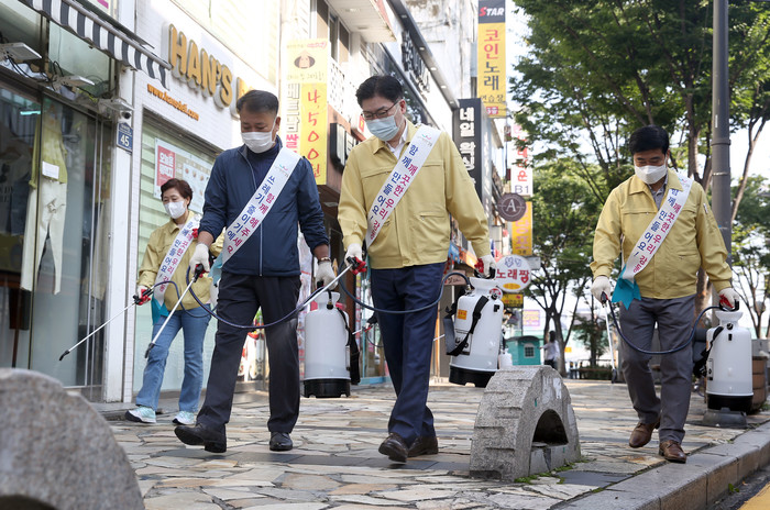 서울 강동구가 최근 코로나19 재확산세에 대응해 천호동 로데오거리 일대에 대한 방역소독과 대청소를 진행했다. 사진은 이정훈 구청장(가운데)이 구청 직원들과 함께 천호동 로데오거리 일대 방역소독을 진행하고 있는 모습. (사진제공=강동구청)