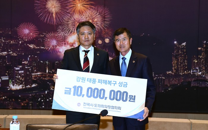 [시민일보 = 이대우 기자] 전국시·도의회의장협의회는 제18호 태풍 ‘미탁’으로 피해를 입은 강원 삼척·강릉시, 경북 울진·영덕·성주군, 경주시, 전남 해남·진도군 지역 이재민을 돕기 위한 성금을 최근 각 도에 전달했다.