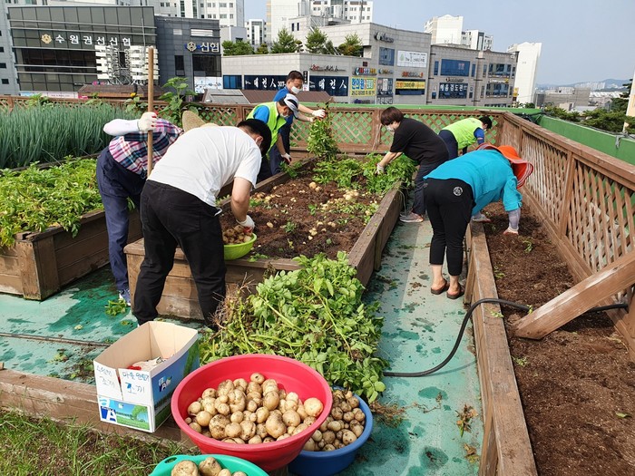 경기 수원시 권선구 세류1동 행정복지센터는 30일 행정복지센터 옥상텃밭에서 감자 약 15상자(10kg/상자)를 수확했다. 감자는 새마을부녀회의 ‘사랑의 반찬 나누기’ 사업에 사용해 홀몸노인 등에 전달할 예정이다. 사진은 이날 감자를 수확하고 있는 모습. (사진제공=권선구청)