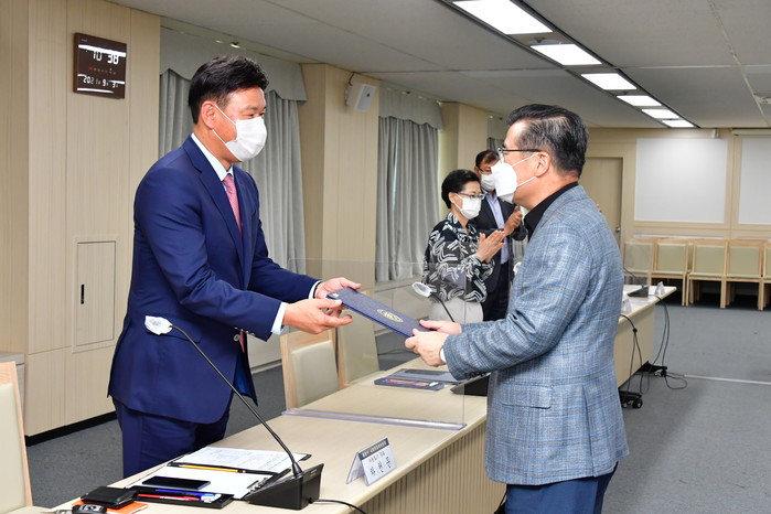 서울 중랑구 사회적경제위원회는 최근 위촉식을 열고 공식 출범했다. 위촉식에서는 사회적경제조직 대표 등 민간위원 9명이 위촉됐으며, 위원회는 앞으로 사회적경제 조직 발굴 및 지원·육성 등에 관해 심의 활동을 펼칠 예정이다. 사진은 이날 류경기 구청장(오른쪽)이 위촉장을 전달하고 있는 모습. (사진제공=중랑구청)