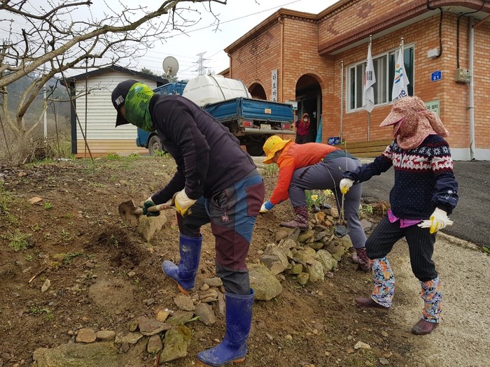 전남 영암군 금정면이 최근 코로나19 장기화로 지친 주민들의 마음을 위로하고 아름다운 마을 가꾸기에 앞장서기 위해 지역내 17개 경로당 주변에 300여본의 목수국(라임라이트)을 식재했다. 사진은 꽃을 심고 있는 관계자들의 모습. (사진제공=영암군청)