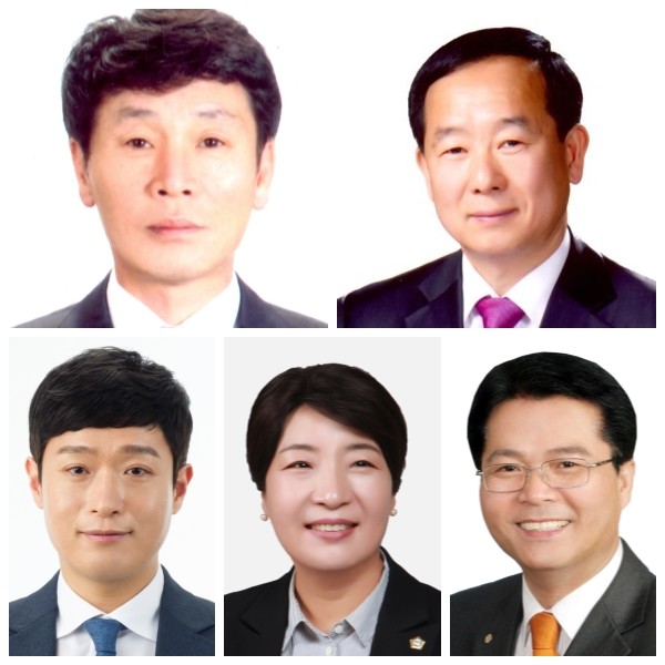 | ▲ (왼쪽 상단부터 시계방향으로) 백승권 의장, 박찬길 부의장, 김용술 위원장, 이경옥 위원장, 김경완 위원장.(사진제공=금천구의회) |