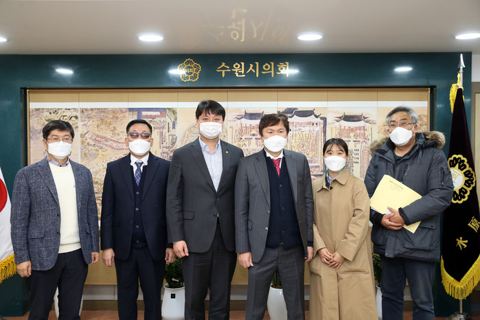 | ▲ 간담회에 참석한 조석환 의장(왼쪽 세 번째)이 관계자들과 기념촬영을 하고 있다. (사진제공=수원시의회) |