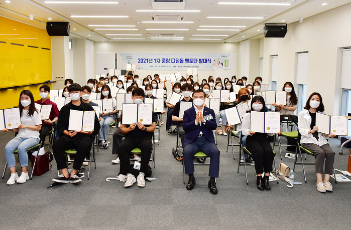 서울 중랑구는 29일 ‘2021년 중랑 디딤돌 멘토단 발대식’을 개최했다. 지역내 대학생과 충북학사 학생으로 구성된 멘토 110명이 참여하며, 학습멘토링·상담멘토링 등을 올해 말까지 실시하게 된다. 사진은 발대식에서 류경기 구청장(앞줄 가운데)과 멘토단이 기념촬영을 하는 모습. (사진제공=중랑구청)