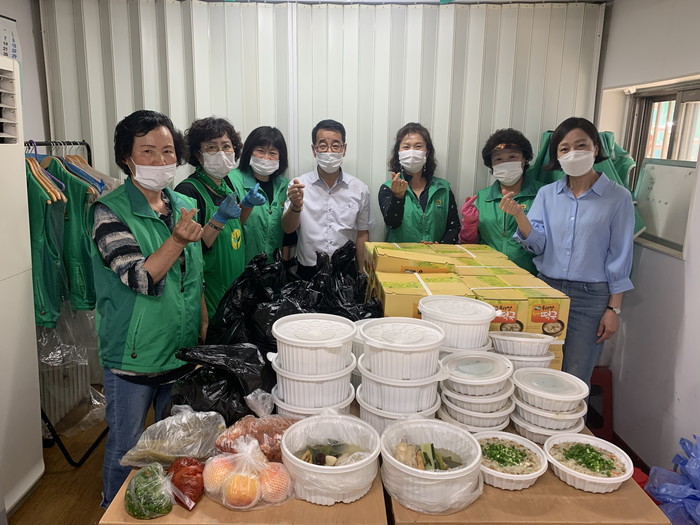 경기 양주시 회천1동 새마을부녀회는 지난 6일 초복을 맞아 지역내 저소득 홀몸노인가구 13명에게 직접 만든 영양 삼계탕·반찬 등을 개별 포장해 전달했다. 사진은 이날 봉사에 참여한 부녀회원들이 기념촬영을 하는 모습. (사진제공=양주시청)