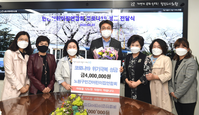 서울 노원구가 7일 구청장실에서 노원구 민간어린이집연합회와 ‘코로나19 위기 극복 성금 전달식’을 개최, 민간어린이집연합회로부터 성금 400만원을 전달받았다. 사진은 오승록 구청장(가운데)과 관계자들이 기념촬영을 하는 모습. (사진제공=노원구청)