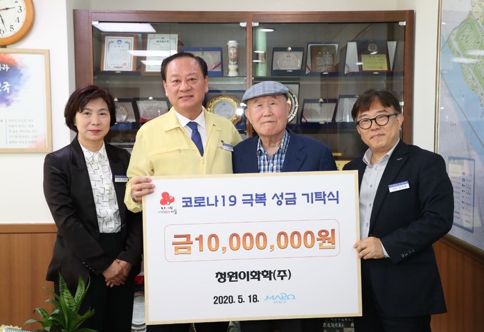 서울 마포구가 18일 청원이화학(주)로부터 코로나19로 어려움을 겪고 있는 지역내 저소득 주민, 장애인 등을 위한 성금 1000만원을 기부받았다. 사진은 유동균 구청장(왼쪽 두 번째)이 성금을 전달 받은 후 김청 대표 및 구 직원들과 기념촬영을 하는 모습. (사진제공=마포구청)