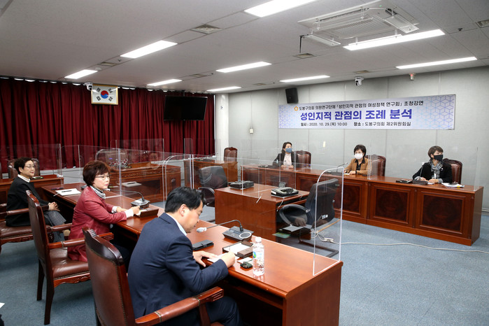 강연은 사례를 중심으로 ▲통계로 본 여성의 현황 ▲성평등 수준 ▲코로나19와 성인지적 시각 ▲성주류화 전략 및 실천도구 ▲생활밀착형 성평등 사회 실현 ▲법령에 대한 성별영향 평가 등을 내용으로 구성됐으며, 도봉구 현 조례상 성별균형 조항이 규정될 필요가 있는 부분에 대해 분석하고 함께 논의하는 시간을 가졌다.