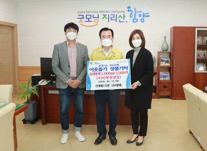 함양군은 12일 (주)미르필코리아(대표이사 이문수)에서 함양지역자활센터를 통해 코로나-19 극복을 위해 자사에서 생산한 손세정제 1,000개(내용량 1,000ml), 400만원 상당을 기부했다고 밝혔다.