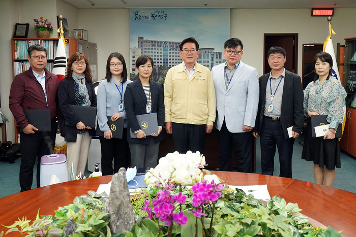 지난 8일 서울 동대문구가 제48회 어버이날을 맞아 지극한 효심으로 부모를 봉양하고 본연의 업무에도 최선을 다해 모범이 되는 공무원 8명을 선정해 표창을 수여했다. 사진은 표창 수여자들과 함께 기념촬영을 하고 있는 유덕열 구청장(가운데)의 모습. (사진제공=동대문구청)