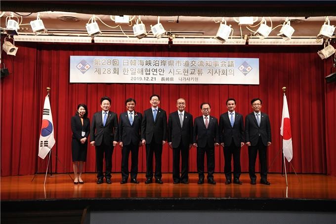 오거돈 부산시장, 김경수 경남도지사, 원희룡 제주도지사, 박병호 전라남도행정부지사와 오가와 히로시 후쿠오카현지사, 코바야시 마리코 사가현부지사, 나카무라 호도 나가사키현지사, 무라오카 쓰구마사 야마구치현지사가 나가사키현 닛쇼칸 신관 바이쇼카쿠 대회의장에서 ‘제28회 한일해협연안 시·도·현교류 지사회의’(이하 한일지사회의)를 열고 양국 공통 현안인 ‘일자리 창출’과 ‘청년 고용’ 대책을 논의했다.
