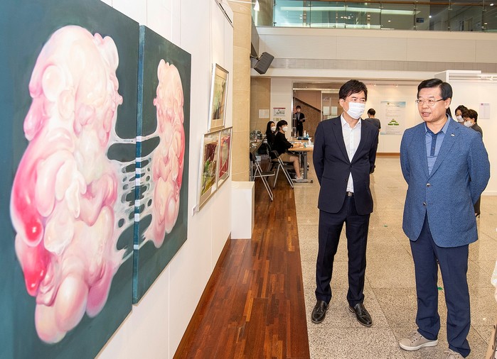 성장현 서울 용산구청장이 22일 용산아트홀 전시장에서 열린 '2020 용산평화예술전' 개막식에 참석했다. 사진은 성 구청장(오른쪽)이 관계자와 함께 예술작품을 감상하고 있는 모습. (사진제공=용산구청)