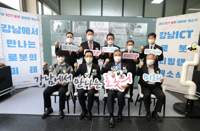 서울 강남구가 로봇과 관련된 창업을 지원하고, 전문 인력을 육성하기 위해 자곡동에 ‘ICT·로봇 리빙랩’을 조성했다. 사진은 개소식에 참석한 정순균 구청장과 박진 국회의원(앞줄 왼쪽 두 번째·세 번째)이 기념촬영을 하고 있는 모습. (사진제공=강남구청)