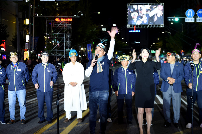 오승록 서울 노원구청장은 최근 노해로 일대 550여m 구간(롯데백화점 사거리~노원 순복음교회)에서 열린 ‘2019 노원 탈축제’ 이튿날 행사에 참석했다. 사진은 오 구청장(앞줄 오른쪽에서 두 번째)이 인사말을 전하고 있는 모습. (사진제공=노원구청)