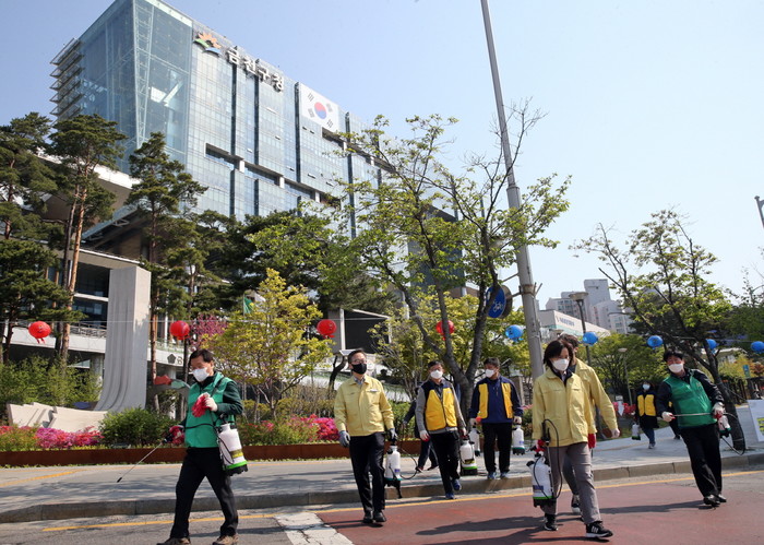 유성훈 서울 금천구청장이 28일 오전 10시부터 지역사회 코로나19 예방과 감염증 조기 극복을 위한 ‘코로나19 클린데이’ 생활방역 활동에 참여했다. 사진은 유 구청장 및 민·관 방역단이 방역활동을 진행하는 모습. (사진제공=금천구청)