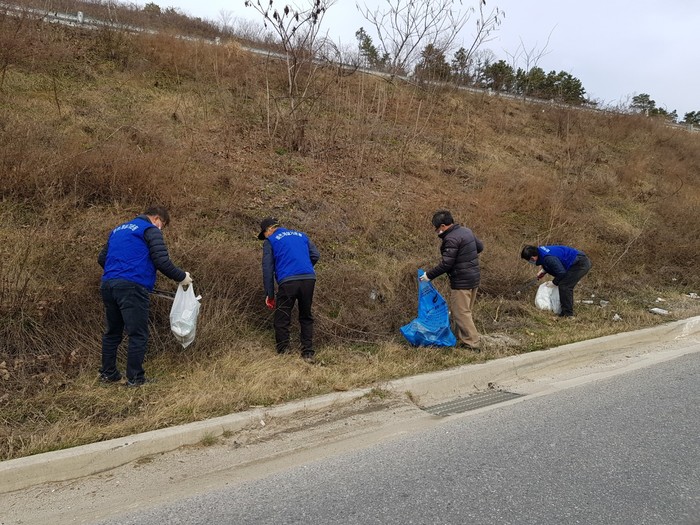 경기 여주시 점동면 바르게살기운동협의회는 최근 점동면 진입로인 청안교차로 주변을 대상으로 깨끗한 생활환경 조성을 위한 새봄맞이 대청소를 전개했다. 사진은 마스크를 낀 협의회 회원들이 교차로 주변 쓰레기를 수거하고 있는 모습. (사진제공=여주시청)