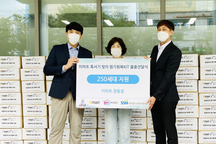 서울 도봉구는 최근 희망마차 사업의 일환으로 이마트 창동점으로부터 3만원 상당의 반계탕·사골곰탕 등 보양식으로 구성된 원기회복키트 250상자를 후원받았다. 구는 전달받은 물품을 동주민센터를 통해 지역의 저소득층에 전달할 예정이다. 사진은 전달식에서 관계자들이 기념촬영을 하는 모습. (사진제공=도봉구청)