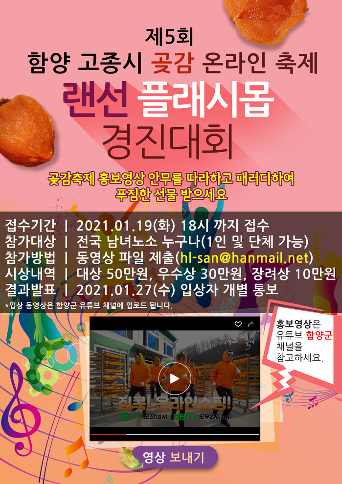 군에 따르면 오는 1월 15일부터 19일까지 온라인으로 진행되는 ‘제5회 함양 고종시 곶감축제’ 기간 중 축제 홍보영상 안무를 따라하고 패러디하는 ‘랜선 플래시몹 경진대회’를 개최할 예정이다.