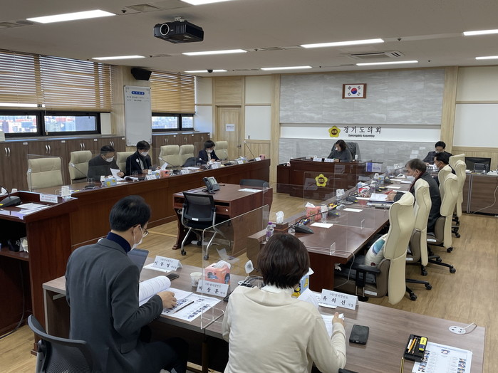 | ▲ 경기도의회 연구단체 정당발전소 소속 의원들이 연구진과 함께 보고회를 진행하고 있다. (사진제공=경기도의회) |