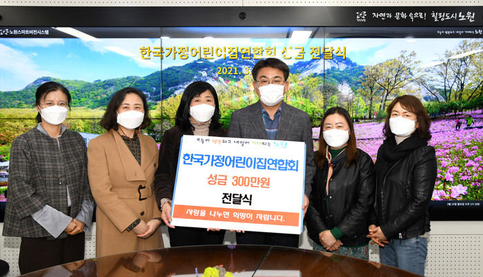 서울 노원구는 15일 노원 한국가정어린이집연합회로부터 코로나19 장기화로 어려움을 겪고 있는 지역내 저소득층을 위한 성금 300만원을 전달받았다. 사진은 전달식에서 오승록 구청장(오른쪽에서 세 번째)이 관계자들과 기념촬영을 하는 모습. (사진제공=노원구청)