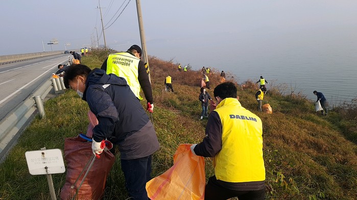 충남 아산시가 아산호내수면자율관리어업공동체 주관으로 아산호방조제 인근 수변에서 환경정화 활동을 실시해 폐기물 및 쓰레기 약 3.2톤을 수거했다. 사진은 아산호방조제 환경개선사업을 펼치고 있는 모습. (사진제공=아산시청)