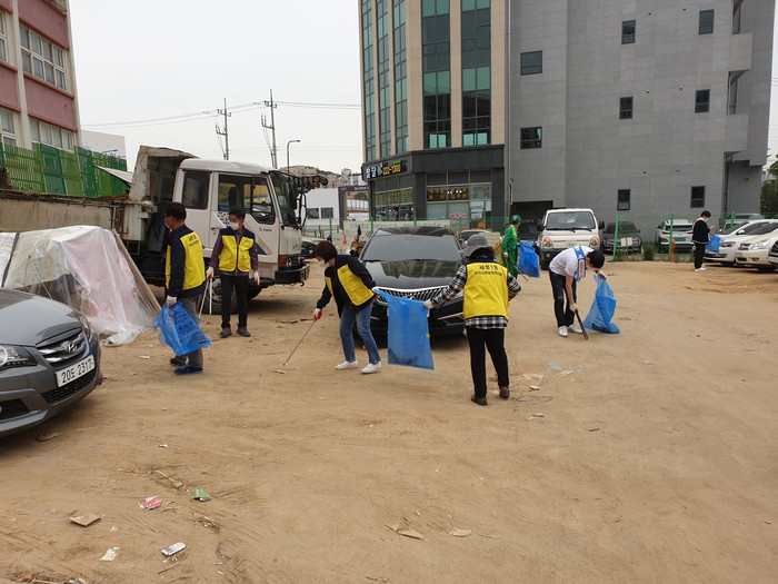 경기 수원시 권선구 세류1동 행정복지센터는 지난 8일 동 단체원, 수성교회, 시 도시교통과 등 30여명과 함께 상습 무단투기 지역 합동 대청소를 실시했다. 이번 대청소는 수성교회 뒤편에 위치한 무상 임시주차장을 중점적으로 실시했다. 사진은 참여자들이 쓰레기를 수거하는 모습. (사진제공=권선구청)