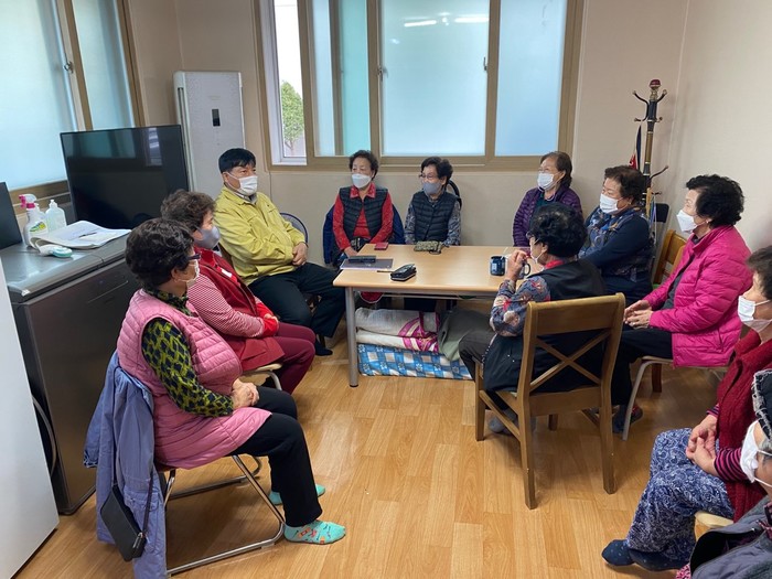 경기 동두천시 불현동 행정복지센터는 최근 지역내 경로당을 방문해 김장김치·마스크 등의 위문품을 전달하고 2차 재난기본소득 신청을 안내하고 있다. 사진은 최근 임태수 불현동장(왼쪽에서 세 번째)이 경로당 노인들과 대화를 하고 있는 모습. (사진제공=동두천시청)